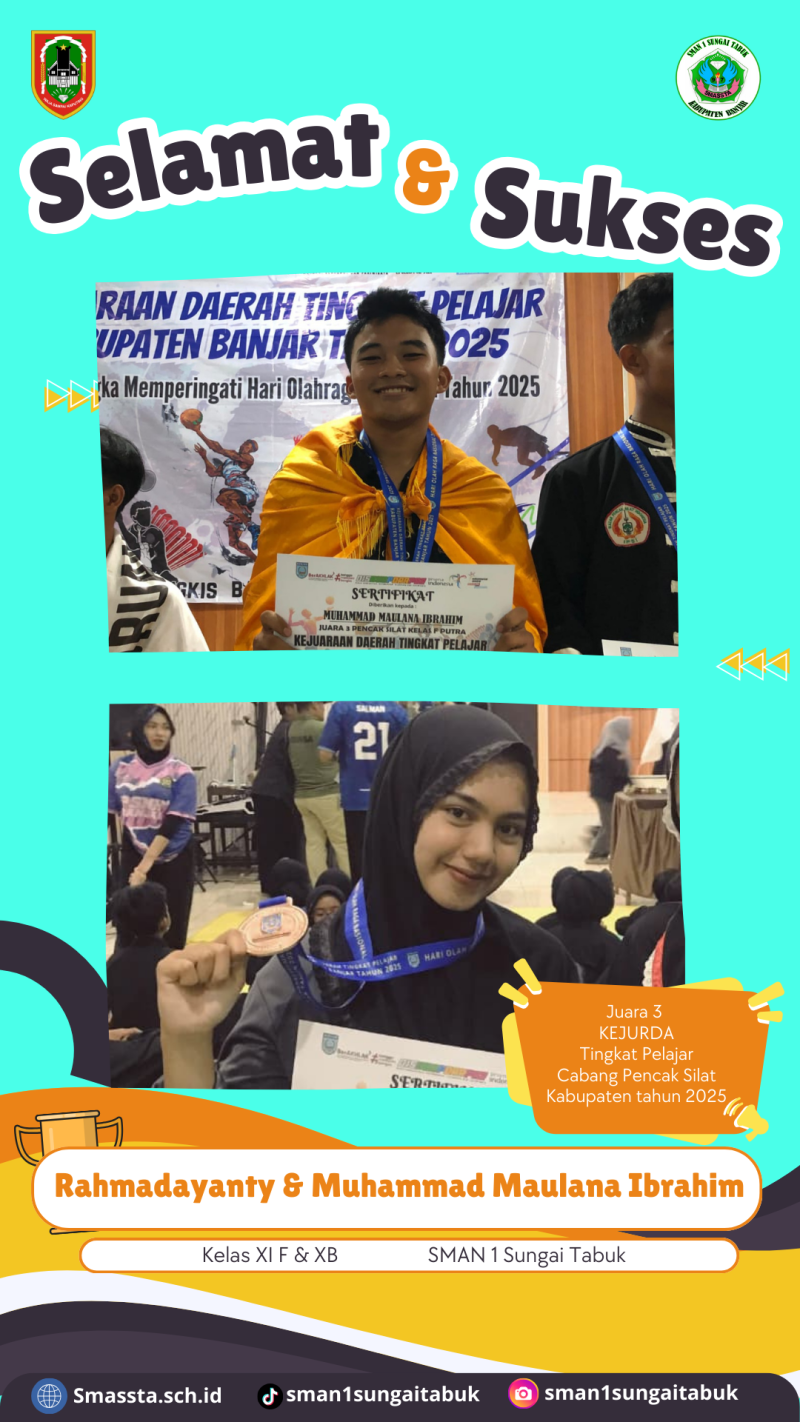 Sungai Tabuk (18/09/25) - SMAN 1 Sungai Tabuk kembali menorehkan prestasi membanggakan di bidang olahraga. Dua siswa berhasil meraih juara dalam ajang Kejuaraan Daerah (Kejurda) Tingkat Pelajar Kabupaten Banjar Tahun 2025 pada cabang olahraga Pencak Silat.